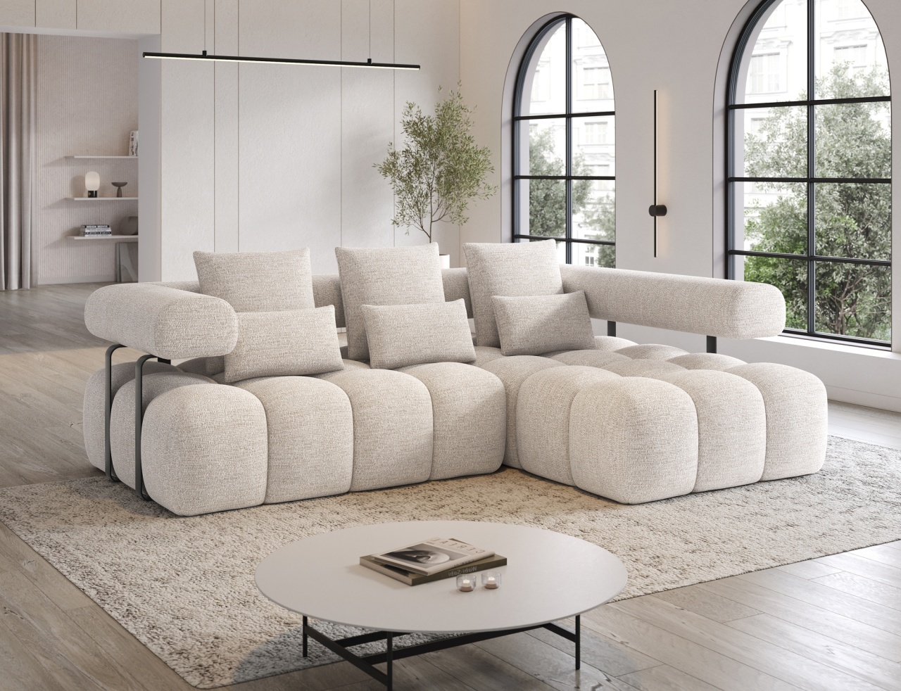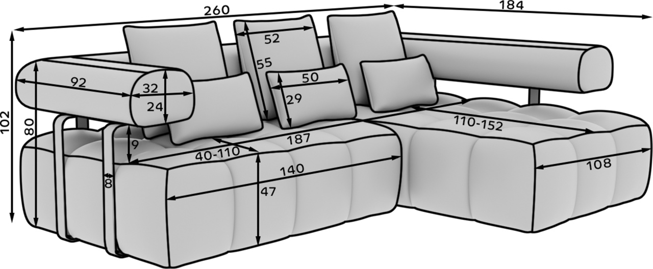 Colțarul Levvi, cu dimensiunile 260×184×102 cm, este o piesă de mobilier modernă și funcțională, concepută pentru confort zilnic și design estetic al locuinței. Echipat cu un sistem de arcuri ondulate de tip B și cu spumă cu înaltă rezistență HR3030, oferă suport optim pentru corp și o construcție durabilă. Funcția practică de transformare în pat permite convertirea rapidă într-un pat confortabil pentru oaspeții care rămân peste noapte. Datorită spatelui complet tapițat, colțarul poate fi plasat liber în încăpere, fără a fi nevoie să fie lipit de perete, oferind mai multă libertate în amenajarea spațiului. Picioarele din plastic negru completează aspectul general și subliniază caracterul modern și minimalist al colțarului. Levvi este soluția ideală pentru cei care caută un colțar elegant cu funcție de pat, care combină stilul modern, confortul și practicitatea zilnică. Dimensiuni: Lungime: 260 cm Adâncime: 184 cm Înălțime: 102 cm Adâncime șezut: 40 cm Înălțime șezut: 47 cm Dimensiuni picioare: 2,5 cm, plastic, negru Greutate: 142,7 kg Capacitate de ridicare: 250 kg Suprafață de dormit: 110×187 cm Produsul nu este montat, montarea este rapidă și ușoară. Produsul este personalizabil, culoarea și materialul se aleg pe baza paletarelor la cererea clientului. Prețul poate suferi modificări în funcție de grupa de material aleasă.