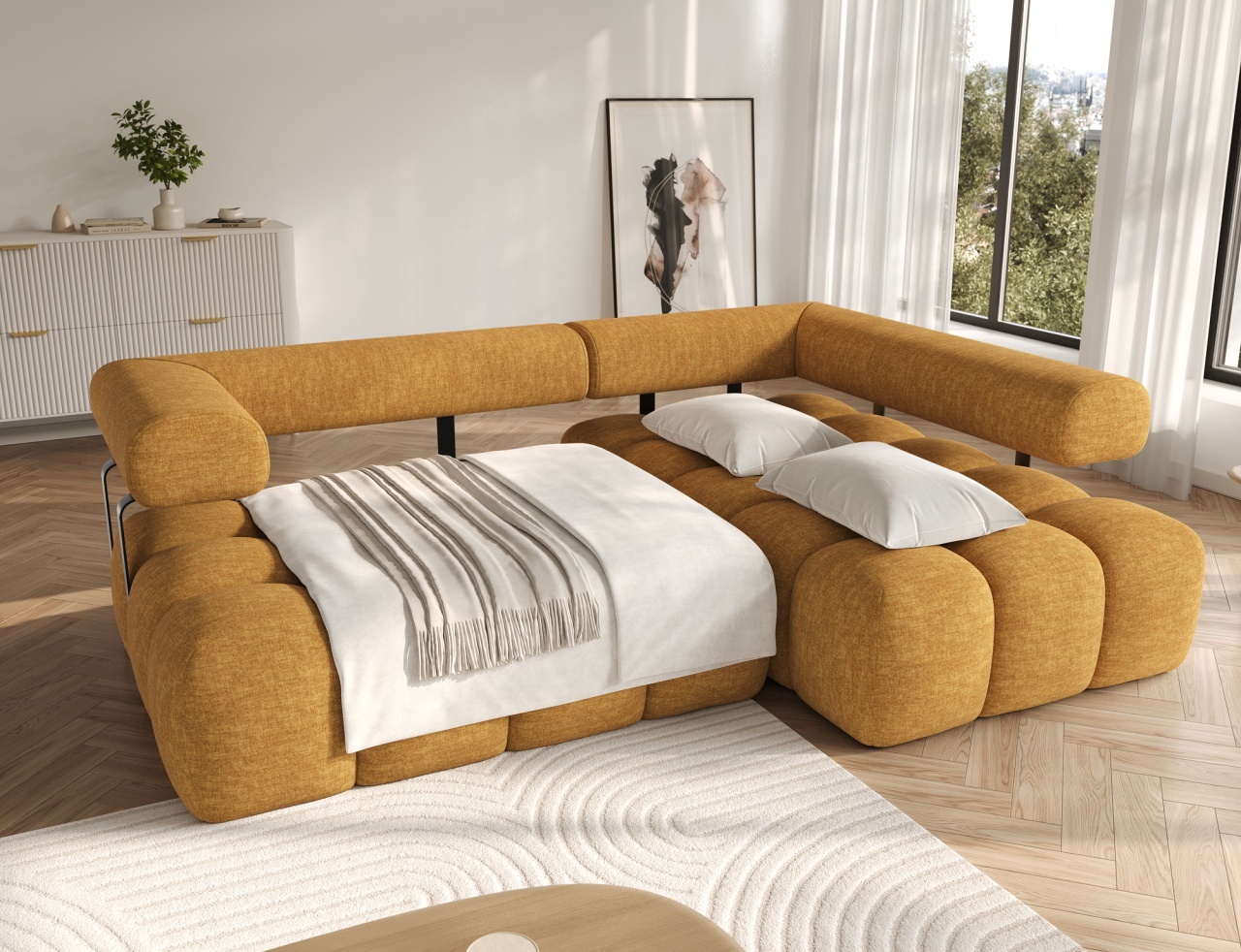 Colțarul Levvi, cu dimensiunile 260×184×102 cm, este o piesă de mobilier modernă și funcțională, concepută pentru confort zilnic și design estetic al locuinței. Echipat cu un sistem de arcuri ondulate de tip B și cu spumă cu înaltă rezistență HR3030, oferă suport optim pentru corp și o construcție durabilă. Funcția practică de transformare în pat permite convertirea rapidă într-un pat confortabil pentru oaspeții care rămân peste noapte. Datorită spatelui complet tapițat, colțarul poate fi plasat liber în încăpere, fără a fi nevoie să fie lipit de perete, oferind mai multă libertate în amenajarea spațiului. Picioarele din plastic negru completează aspectul general și subliniază caracterul modern și minimalist al colțarului. Levvi este soluția ideală pentru cei care caută un colțar elegant cu funcție de pat, care combină stilul modern, confortul și practicitatea zilnică. Dimensiuni: Lungime: 260 cm Adâncime: 184 cm Înălțime: 102 cm Adâncime șezut: 40 cm Înălțime șezut: 47 cm Dimensiuni picioare: 2,5 cm, plastic, negru Greutate: 142,7 kg Capacitate de ridicare: 250 kg Suprafață de dormit: 110×187 cm Produsul nu este montat, montarea este rapidă și ușoară. Produsul este personalizabil, culoarea și materialul se aleg pe baza paletarelor la cererea clientului. Prețul poate suferi modificări în funcție de grupa de material aleasă.