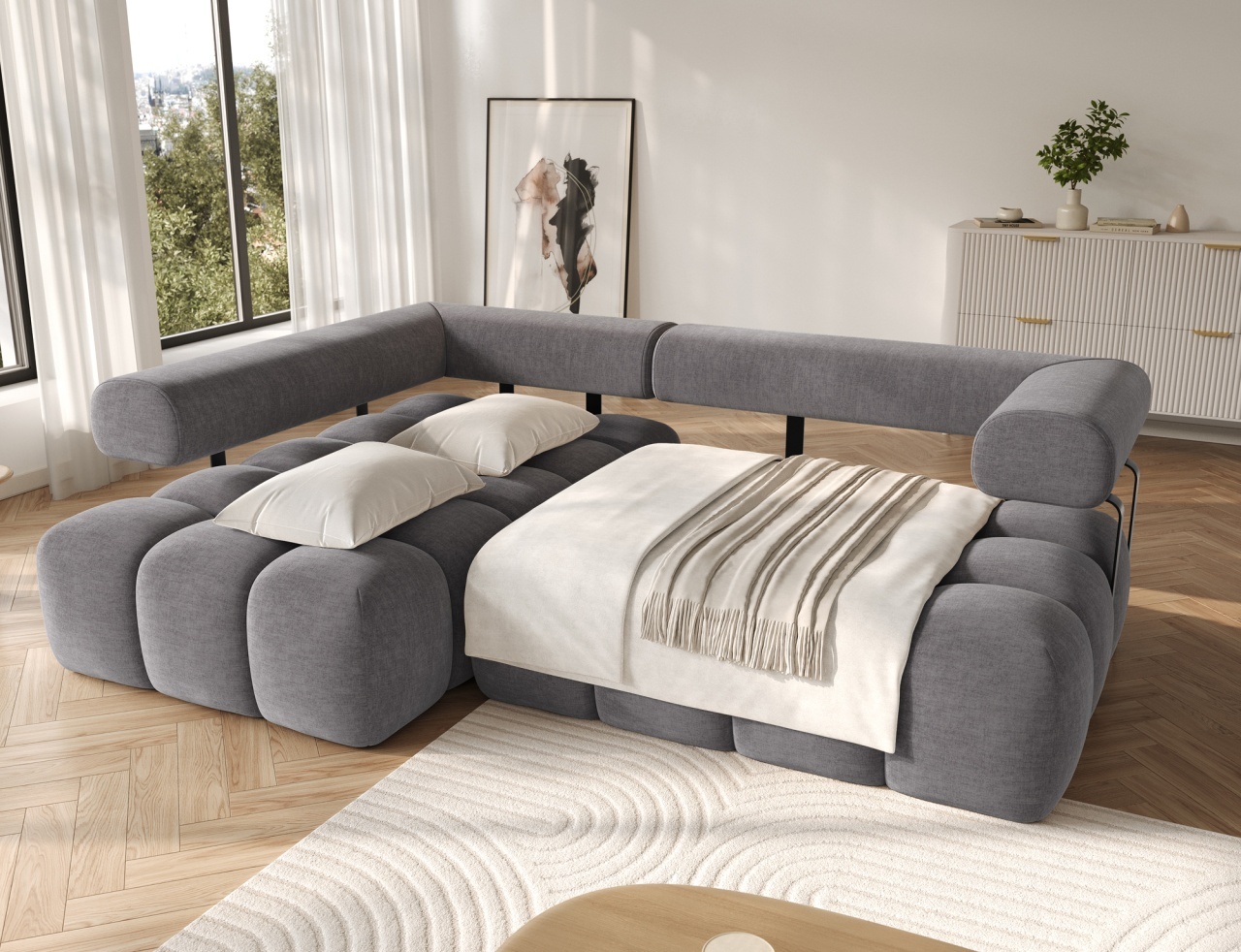 Colțarul Levvi, cu dimensiunile 260×184×102 cm, este o piesă de mobilier modernă și funcțională, concepută pentru confort zilnic și design estetic al locuinței. Echipat cu un sistem de arcuri ondulate de tip B și cu spumă cu înaltă rezistență HR3030, oferă suport optim pentru corp și o construcție durabilă. Funcția practică de transformare în pat permite convertirea rapidă într-un pat confortabil pentru oaspeții care rămân peste noapte. Datorită spatelui complet tapițat, colțarul poate fi plasat liber în încăpere, fără a fi nevoie să fie lipit de perete, oferind mai multă libertate în amenajarea spațiului. Picioarele din plastic negru completează aspectul general și subliniază caracterul modern și minimalist al colțarului. Levvi este soluția ideală pentru cei care caută un colțar elegant cu funcție de pat, care combină stilul modern, confortul și practicitatea zilnică. Dimensiuni: Lungime: 260 cm Adâncime: 184 cm Înălțime: 102 cm Adâncime șezut: 40 cm Înălțime șezut: 47 cm Dimensiuni picioare: 2,5 cm, plastic, negru Greutate: 142,7 kg Capacitate de ridicare: 250 kg Suprafață de dormit: 110×187 cm Produsul nu este montat, montarea este rapidă și ușoară. Produsul este personalizabil, culoarea și materialul se aleg pe baza paletarelor la cererea clientului. Prețul poate suferi modificări în funcție de grupa de material aleasă.