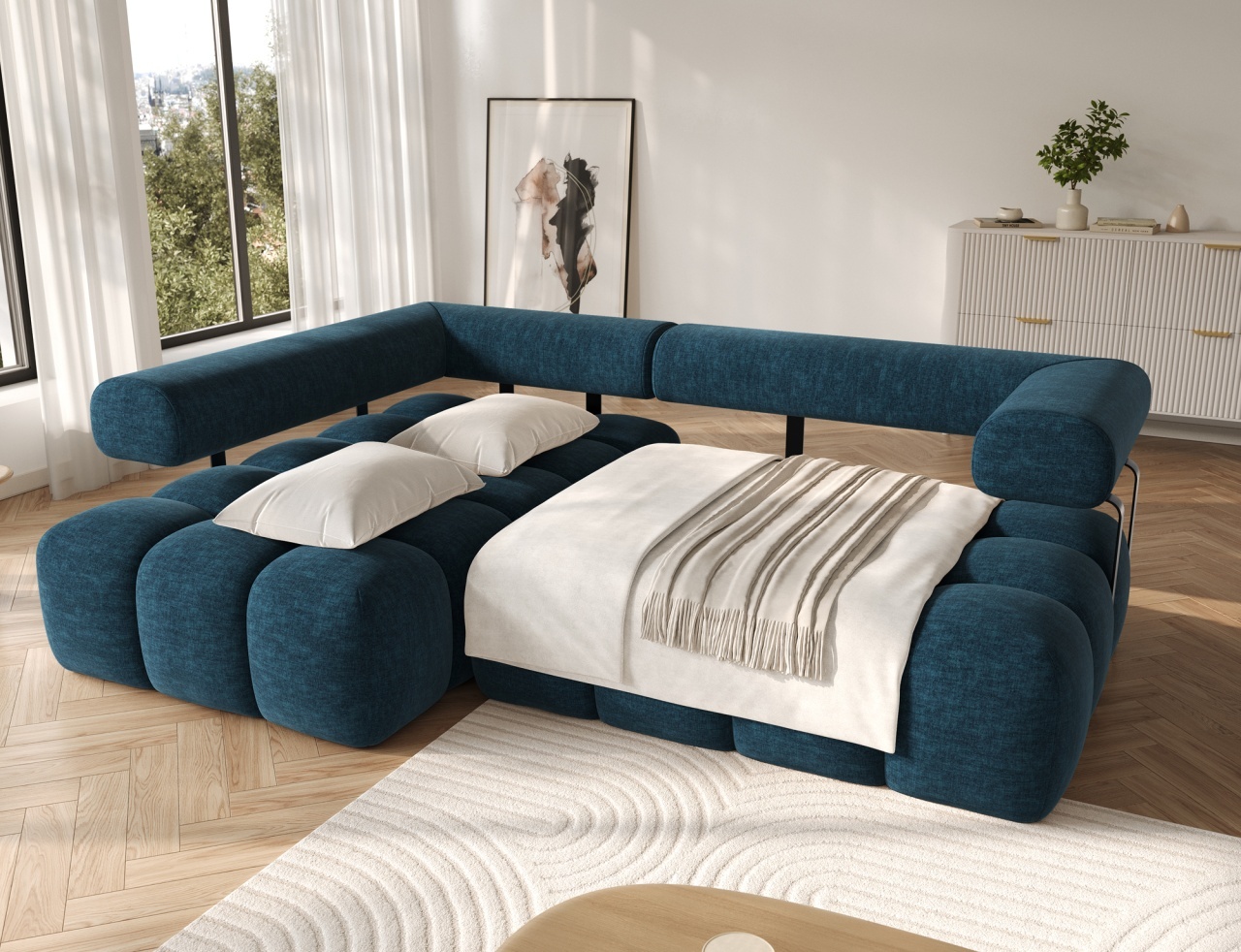 Colțarul Levvi, cu dimensiunile 260×184×102 cm, este o piesă de mobilier modernă și funcțională, concepută pentru confort zilnic și design estetic al locuinței. Echipat cu un sistem de arcuri ondulate de tip B și cu spumă cu înaltă rezistență HR3030, oferă suport optim pentru corp și o construcție durabilă. Funcția practică de transformare în pat permite convertirea rapidă într-un pat confortabil pentru oaspeții care rămân peste noapte. Datorită spatelui complet tapițat, colțarul poate fi plasat liber în încăpere, fără a fi nevoie să fie lipit de perete, oferind mai multă libertate în amenajarea spațiului. Picioarele din plastic negru completează aspectul general și subliniază caracterul modern și minimalist al colțarului. Levvi este soluția ideală pentru cei care caută un colțar elegant cu funcție de pat, care combină stilul modern, confortul și practicitatea zilnică. Dimensiuni: Lungime: 260 cm Adâncime: 184 cm Înălțime: 102 cm Adâncime șezut: 40 cm Înălțime șezut: 47 cm Dimensiuni picioare: 2,5 cm, plastic, negru Greutate: 142,7 kg Capacitate de ridicare: 250 kg Suprafață de dormit: 110×187 cm Produsul nu este montat, montarea este rapidă și ușoară. Produsul este personalizabil, culoarea și materialul se aleg pe baza paletarelor la cererea clientului. Prețul poate suferi modificări în funcție de grupa de material aleasă.