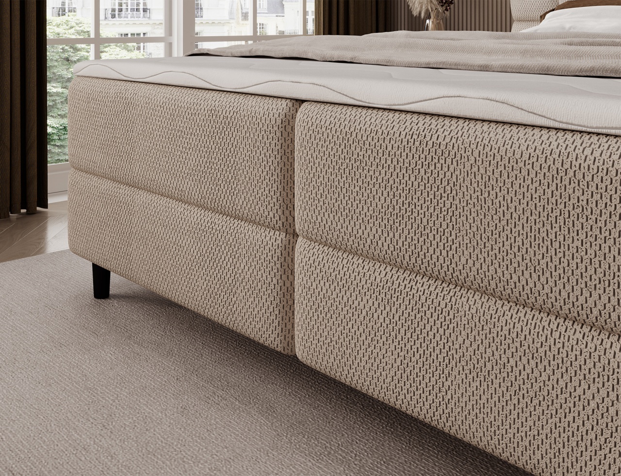 Patul boxspring Camma îmbină designul modern, funcționalitatea și confortul somnului, fiind alegerea perfectă pentru un dormitor elegant și practic; disponibil în trei variante de dimensiuni: 140x200 cm, 160x200 cm și 180x200 cm - permite o adaptare ideală la spațiu și la nevoile utilizatorilor, iar construcția solidă, cu o înălțime totală de 102 cm și o înălțime a șezutului de 56 cm, asigură confortul zilnic. Tapițat cu o țesătură de înaltă calitate, plăcută la atingere, se remarcă prin tăblia estetică cu matlasare elegantă, adăugând o notă de eleganță modernă și oferind un sprijin ideal pentru momentele de relaxare de seară. Lada de depozitare practică pentru lenjeria de pat ajută la menținerea ordinii în dormitor și la utilizarea optimă a spațiului, ceea ce face ca patul Camma să fie nu doar confortabil, ci și extrem de funcțional. Întregul ansamblu este completat de picioare negre din lemn, cu o înălțime de 10 cm, care oferă lejeritate construcției și facilitează curățenia sub pat. Modelul Camma este alegerea ideală pentru cei care apreciază stilul modern, eleganța, durabilitatea și confortul, garantând un somn sănătos și liniștit în fiecare zi. Dimensiuni: Lățime: 182 cm Lungime: 222 cm Înălțime: 102 cm Înălțime șezut: 56 cm Suprafață dormit: 160x200 cm Înălțime picioare: 10 cm Recipient depozitare lenjerie de pat: 2x 182x76x15 cm Spătar tapițat: nu Capacitate ridicare: 240 kg Produsul nu este montat, montarea este rapidă și ușoară. Produsul este personalizabil, culoarea și materialul se aleg pe baza paletarelor la cererea clientului. Prețul poate suferi modificări în funcție de grupa de material aleasă.