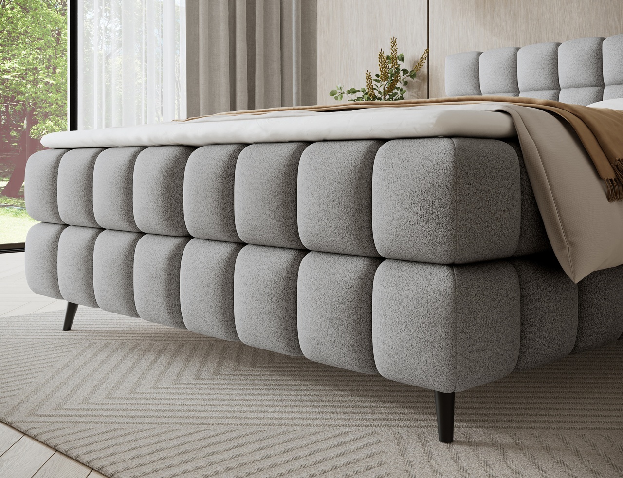 Patul continental Sabeno este o alegere elegantă și funcțională pentru orice dormitor modern. Modelul este disponibil în trei variante de dimensiuni: 140x200 cm, 160x200 cm și 180x200 cm, permițându-vă să ajustați lățimea patului în funcție de nevoile individuale. Confortul în timpul somnului este asigurat de combinația dintre arcurile Bonell și spuma T2540, care oferă susținere adecvată și durabilitate. Patul Sabeno este echipat cu un compartiment practic pentru depozitarea lenjeriei. Picioarele negre din lemn completează designul, adăugând eleganță subtilă și lejeritate. Stilul modern al patului Sabeno îl face să se potrivească perfect atât în interioare minimaliste, cât și în amenajări mai expresive. Datorită funcționalității, materialelor de înaltă calitate și finisajului estetic, patul continental Sabeno este alegerea ideală pentru cei care apreciază confortul, durabilitatea și mobilierul de dormitor stilat. Dimensiuni: Lățime: 162 cm Lungime: 222 cm Înălțime: 102 cm Înălțime șezut: 56 cm Suprafață dormit: 140x200 cm Înălțime picioare: 10 cm Recipient depozitare lenjerie de pat: 2x 182x66x15 cm Spătar tapițat: nu Capacitate ridicare: 220 kg Produsul nu este montat, montarea este rapidă și ușoară. Produsul este personalizabil, culoarea și materialul se aleg pe baza paletarelor la cererea clientului. Prețul poate suferi modificări în funcție de grupa de material aleasă.